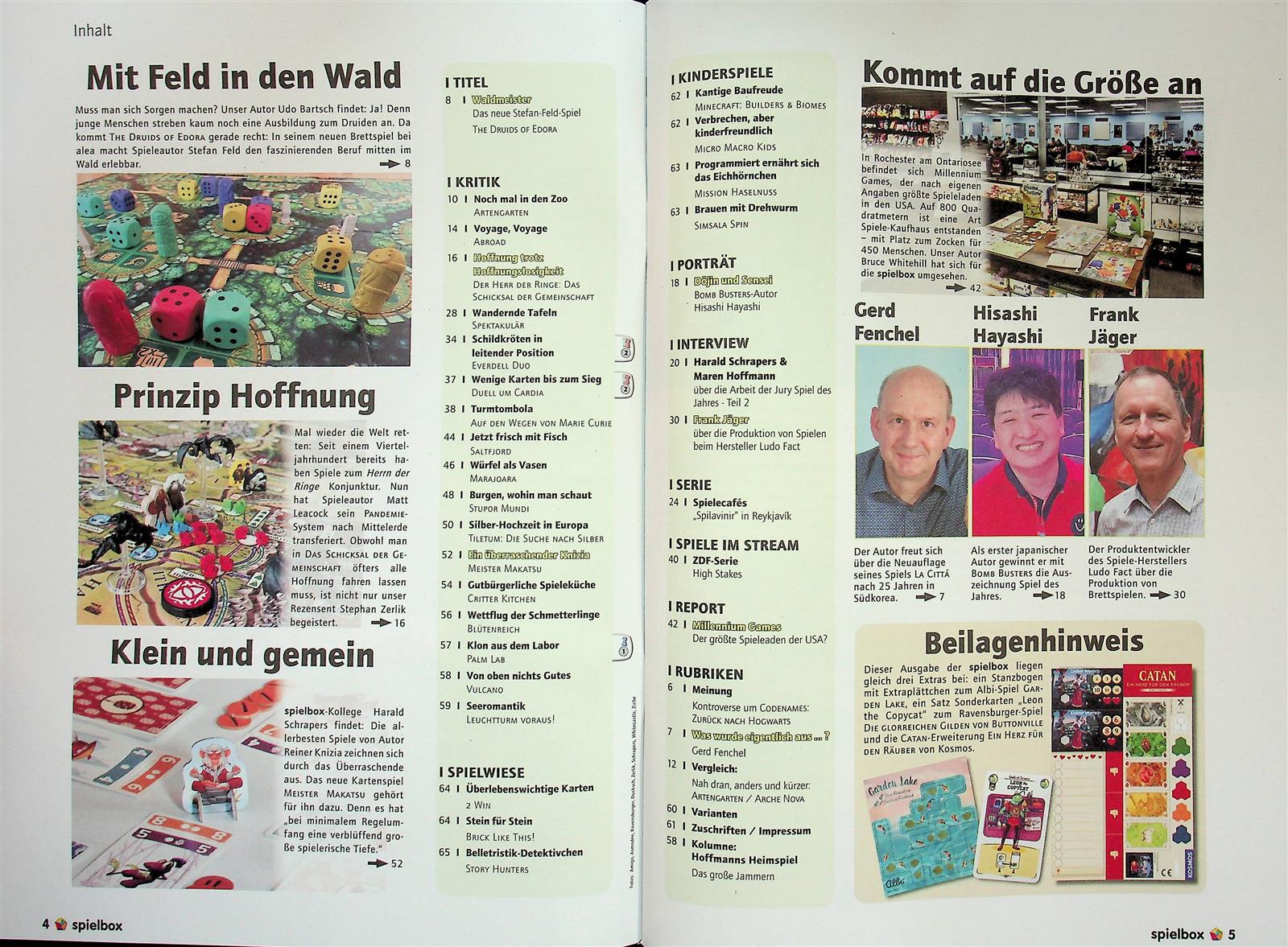 KMW feiert 80 Jahre und bleibt ein Urgestein der Spieleszene. Die Jury „Spiel des Jahres“ stellte sich den Fragen der spielbox, die auch bei der Preisverleihung vor Ort war. Zudem stellen wir zwei spannende Bücher vor, berichten über Monopoly als Fluchthelfer im Zweiten Weltkrieg, über die neue Eigenentwicklung „Calupum“ von Board Game Box und liefern zahlreiche Rezensionen aktueller Spiele wie Arcs, Kauri oder Life of the Amazonia.