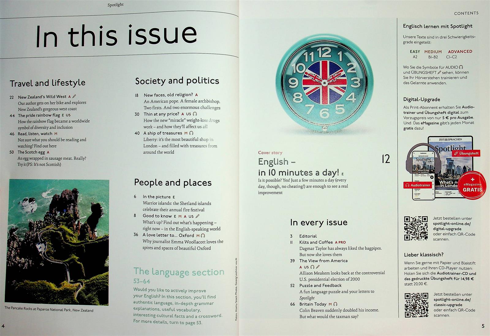 Typisch Spotlight: Neben Reportagen und Interviews gibt es Kolumnen wie „In the Spotlight“ oder „Everyday English“, die Redewendungen, Sprachfallen und typische Situationen aus dem Alltag behandeln. Viele Beiträge enthalten Vokabelerklärungen direkt am Rand, Hörtexte mit Audio-Files über das Online-Portal, sowie optional ein separat bestellbares Übungsheft, das gezielt Grammatik und Wortschatz trainiert.