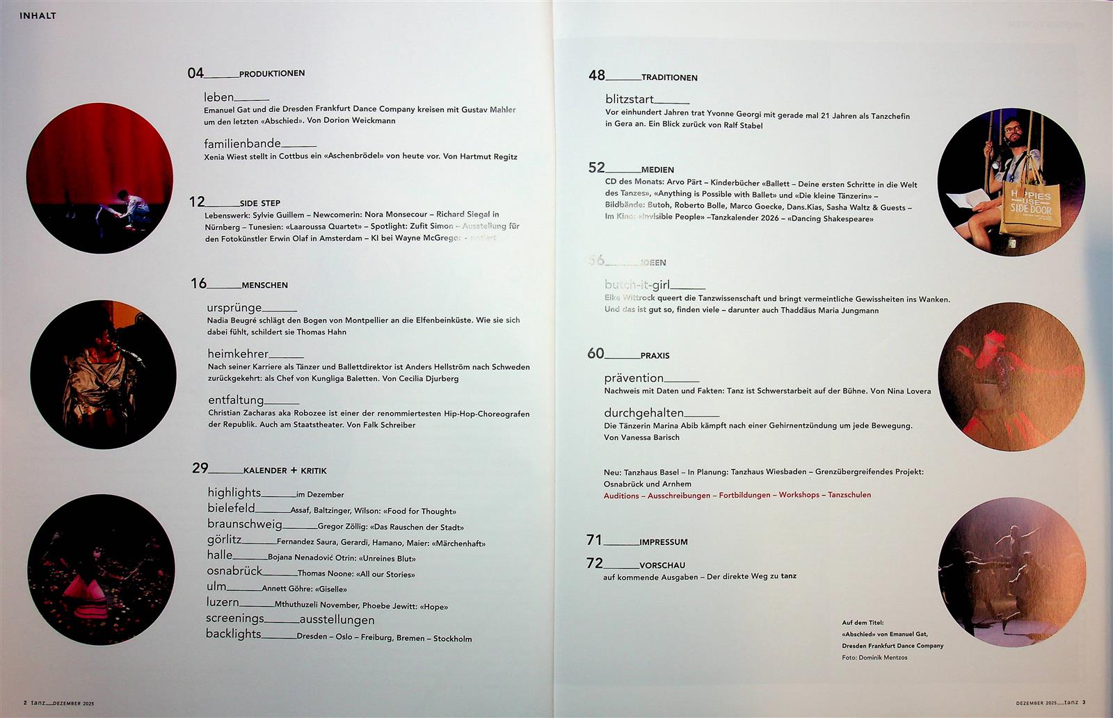 Das Jahrbuch von Tanz widmet sich jeweils einem zentralen Thema und ermittelt in einer international angelegten Umfrage die wichtigsten Produktionen, Choreografen, Tänzer und Kompanien der vergangenen Saison.