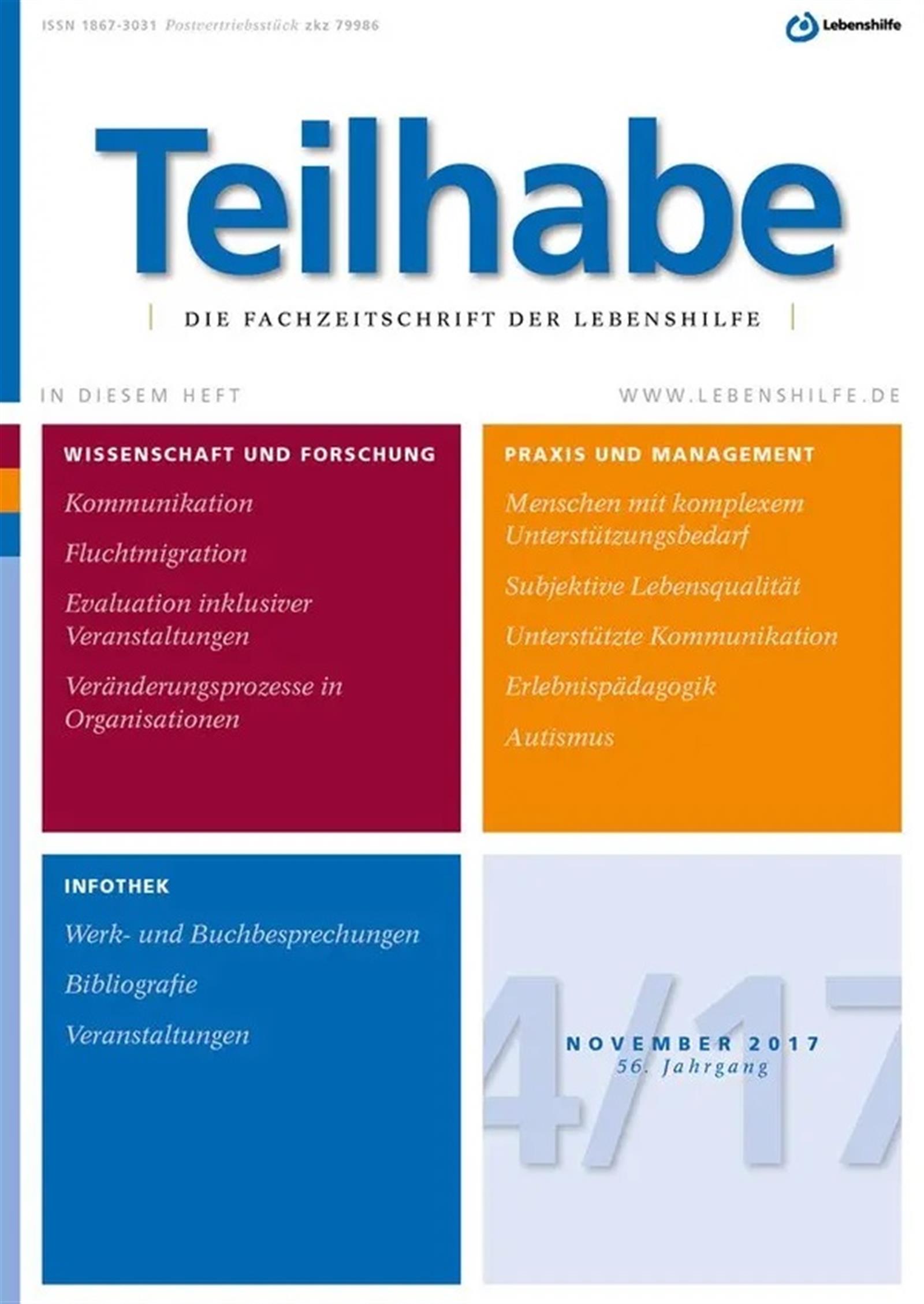 Die Teilhabe bietet viermal im Jahr Fachbeiträge in den Rubriken Wissenschaft und Forschung, Praxis und Management sowie eine Infothek. Wissenschaftler*innen und Fachleute aus Pädagogik, Psychologie, Soziologie,
