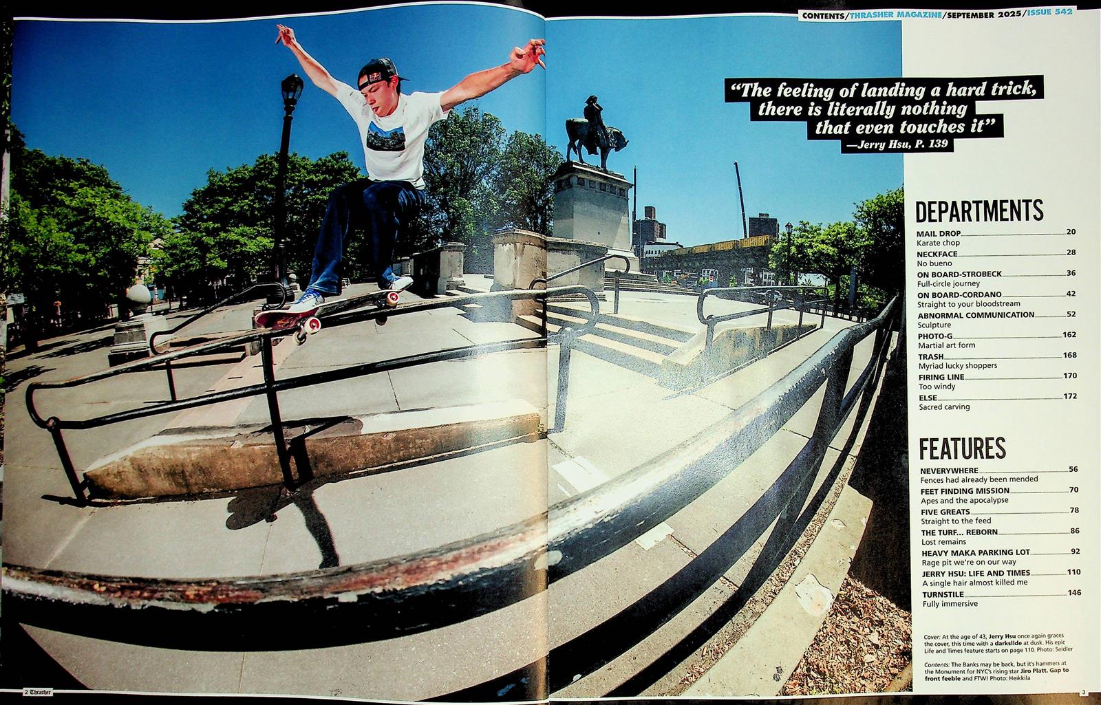 Die Zeitschrift Thrasher ist eine bekannte amerikanische Skateboard-Zeitschrift, die seit den 1980er Jahren existiert. Sie ist besonders unter Skateboardern beliebt und bekannt für ihre legendären Titelbilder und Skateboard-Videos. Thrasher deckt alle Aspekte der Skateboard-Kultur ab, von Skateboard-Contests bis hin zu Skateboard-Trends und Profi-Skateboardern. Die Zeitschrift hat einen starken Einfluss in der Skateboard-Gemeinschaft und wird von Skateboard-Fans auf der ganzen Welt geschätzt.