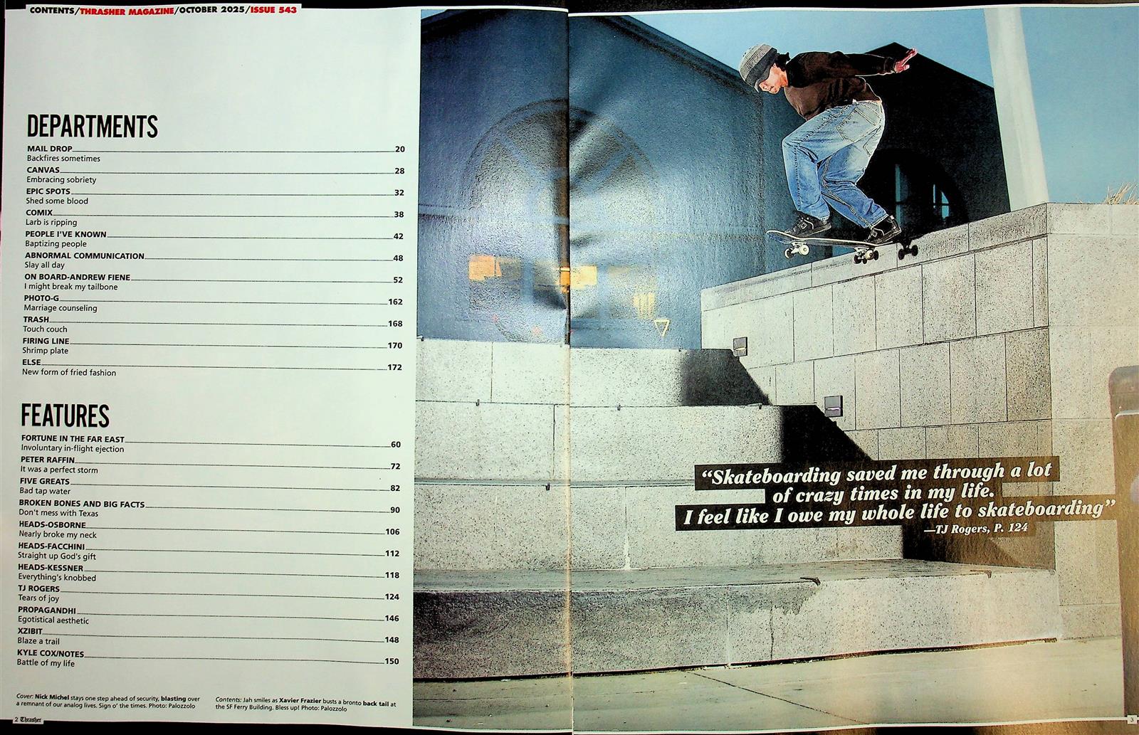 Thrasher bietet eine Vielzahl von Inhalten rund um die Skateboardkultur. Zu den Hauptthemen gehören Skateboardtricks, Rider-Profile, Interviews, Veranstaltungsberichte und Produktbewertungen. Die Leser können sich über die neuesten Trends und Entwicklungen in der Skateboardwelt informieren und werden immer auf dem Laufenden gehalten. Zudem finden sie in jeder Ausgabe beeindruckende Fotos und fesselnde Geschichten aus der Welt des Skateboardens. Die Zeitschrift richtet sich an Skateboard-Enthusiasten jeden Alters und bietet eine inspirierende Plattform, um sich mit Gleichgesinnten auszutauschen und neue Ideen zu sammeln. Mit ihrem einzigartigen Stil und ihrer langjährigen Erfahrung ist Thrasher eine der führenden Quellen für alle Skateboardfans weltweit.