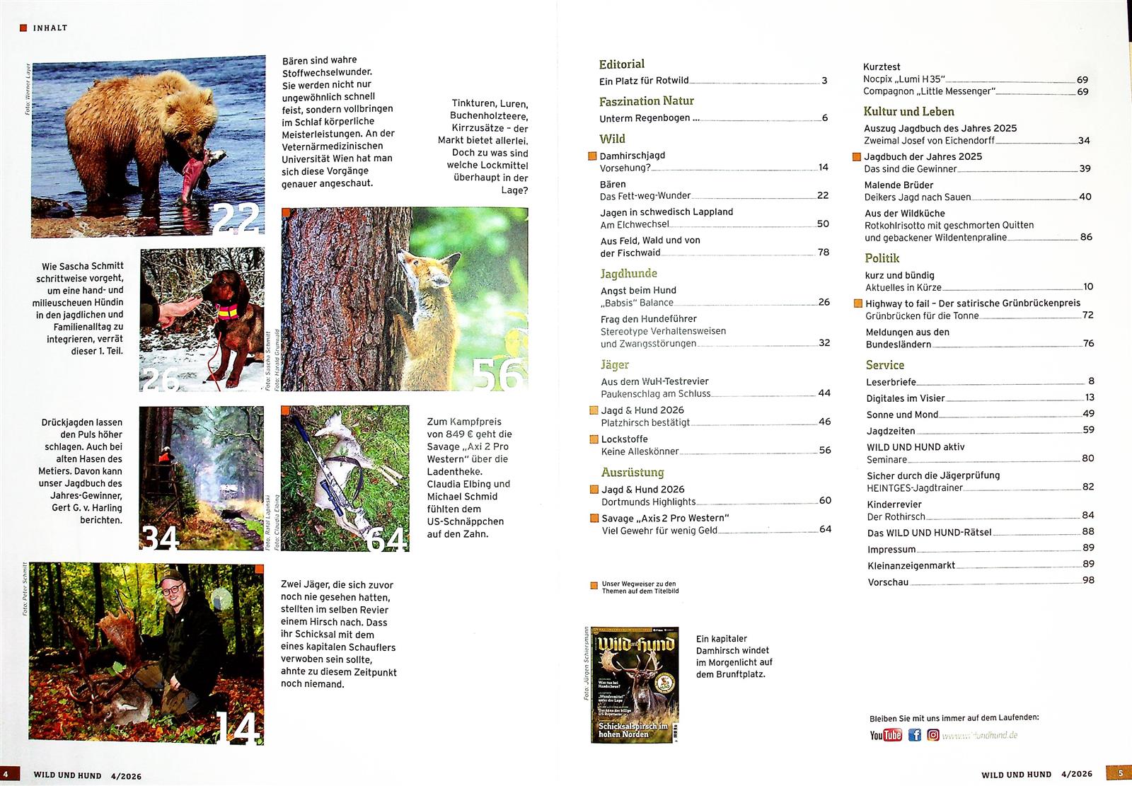 Jede Ausgabe enthält fundierte Fachbeiträge, spannende Praxisberichte, rechtliche Einschätzungen sowie Produktvorstellungen und Testberichte. Dabei wird großer Wert auf Authentizität, Qualität und praktische Relevanz gelegt. Besonders geschätzt wird Wild und Hund für seine lesernahen Revierreportagen und das tiefe Verständnis für die jagdliche Tradition in Verbindung mit aktuellem Wissen.