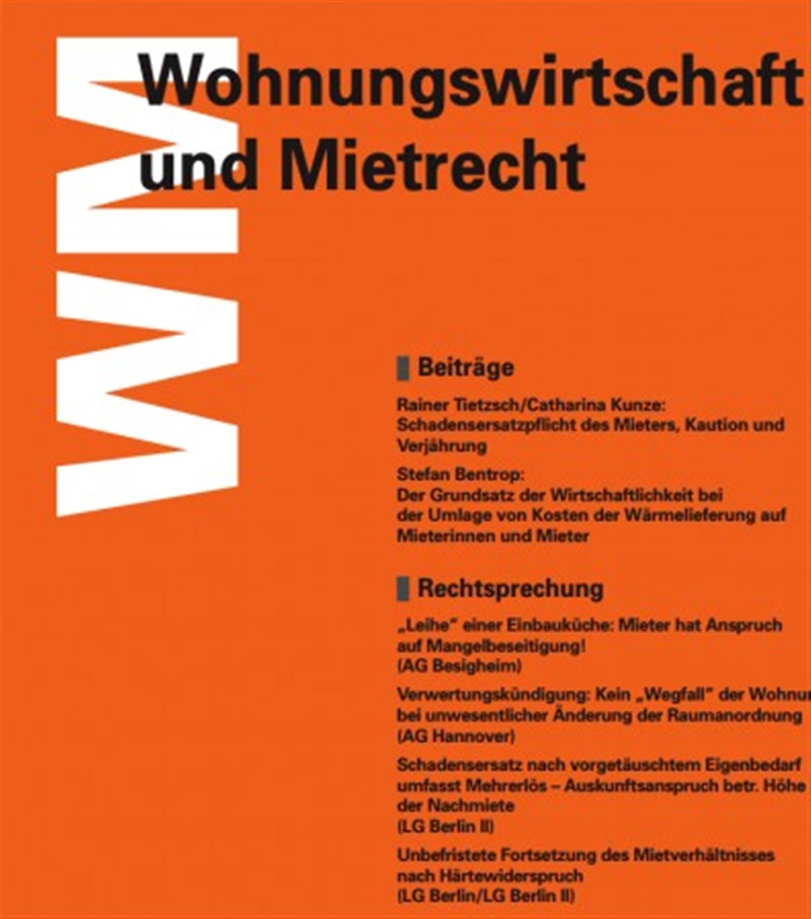 Die monatliche Fachzeitschrift für Gerichte, Rechtsanwälte, Wohnungswirtschaft, Mieter, Vermieter und Wohnungseigentümer mit allen Grundsatzurteilen, Fachaufsätzen, Statistiken, Daten, Informationen zu Gesetzgebung und Verordnungsverfahren.