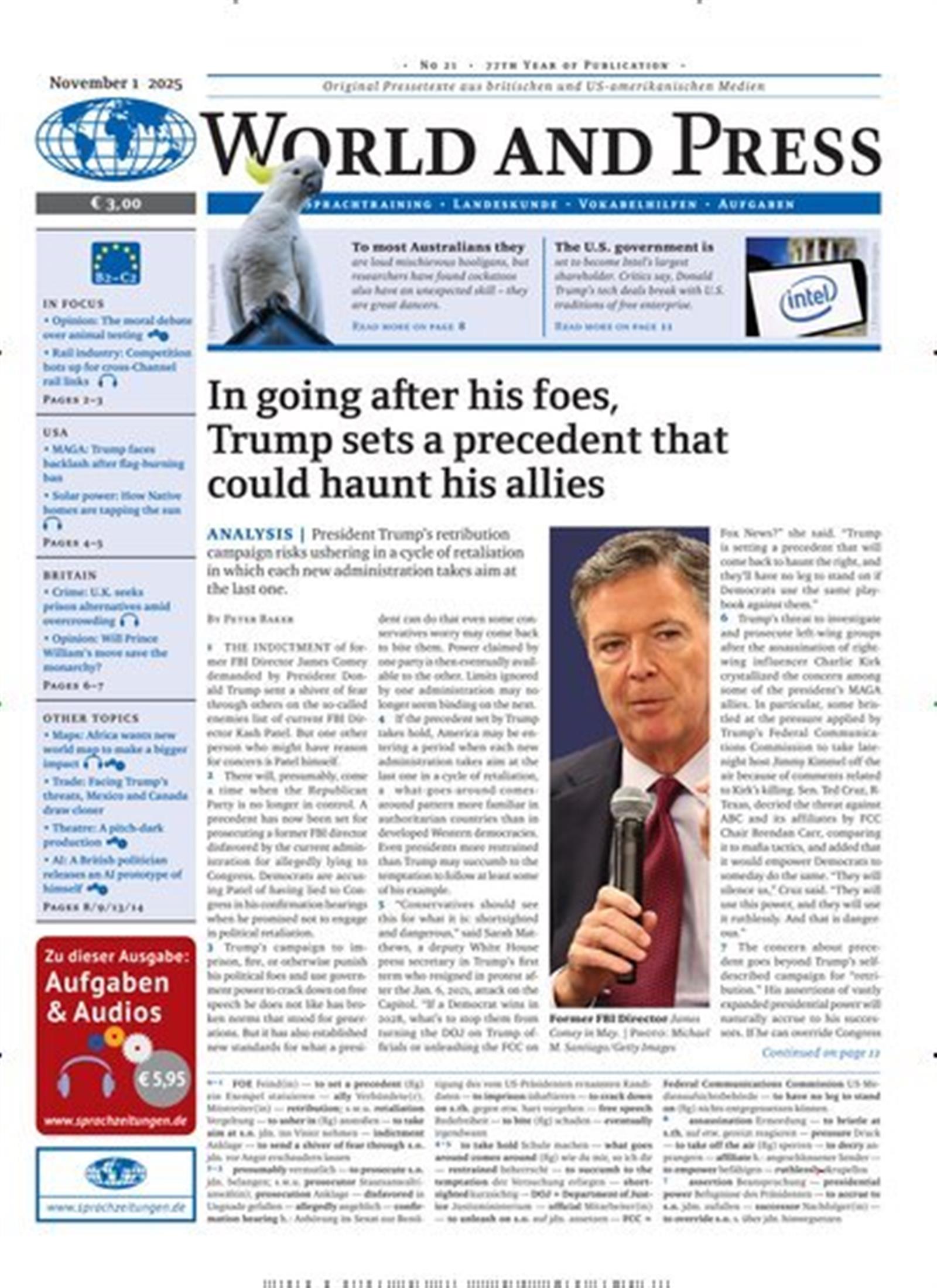 Unter den Sprachzeitschriften nimmt die World and Press eine Sonderstellung ein. Bereits seit 1949 erscheint das Magazin und sammelt Originalartikel aus britischen und US–amerikanischen Zeitschriften und Zeitungen. Die Zeitschrift erscheint vierzehntäglich. Das Premium-Abo beinhaltet die Zeitschrift, die Onlinehilfe und die mp3 im Komplettpaket. Bitte geben Sie bei der Bestellung die Mailadresse an, an die die Materialien geschickt werden sollen.