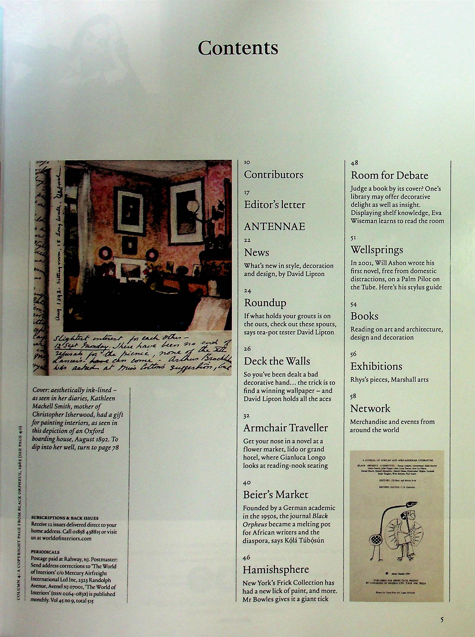 Das Magazin World of Interiors gehört zu den einflussreichsten Magazinen für Inneneinrichtung in Großbritannien. Es richtet sich sowohl an Berufsdesigner wie auch an Dekorationsfans und neue Hauseigentümer - an alle, die die richtige Inneneinrichtung und ein individueller Lebensstil mit Begeisterung erfüllt, die aufs Detail achten und Stil und Qualität zu schätzen wissen. Ein inspirierendes und exklusives Magazin mit Wohnreportagen aus aller Welt, aufwendig illustriert und mit vielen Produktempfehlungen.