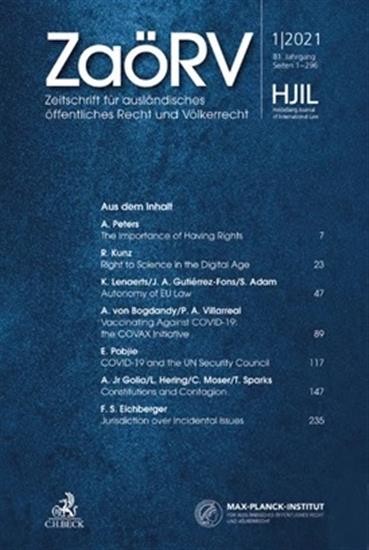 Die "Zeitschrift für ausländisches öffentliches Recht und Völkerrecht" (ZaöRV)/ Heidelberg Journal of International Law (HJIL) erscheint seit 1929. Herausgeber:innen sind die Direktor:innen des Max-Planck-Instituts für ausländisches öffentliches Recht und Völkerrecht, Heidelberg, in Gemeinschaft mit weiteren institutsangehörigen Wissenschaftler:innen.
