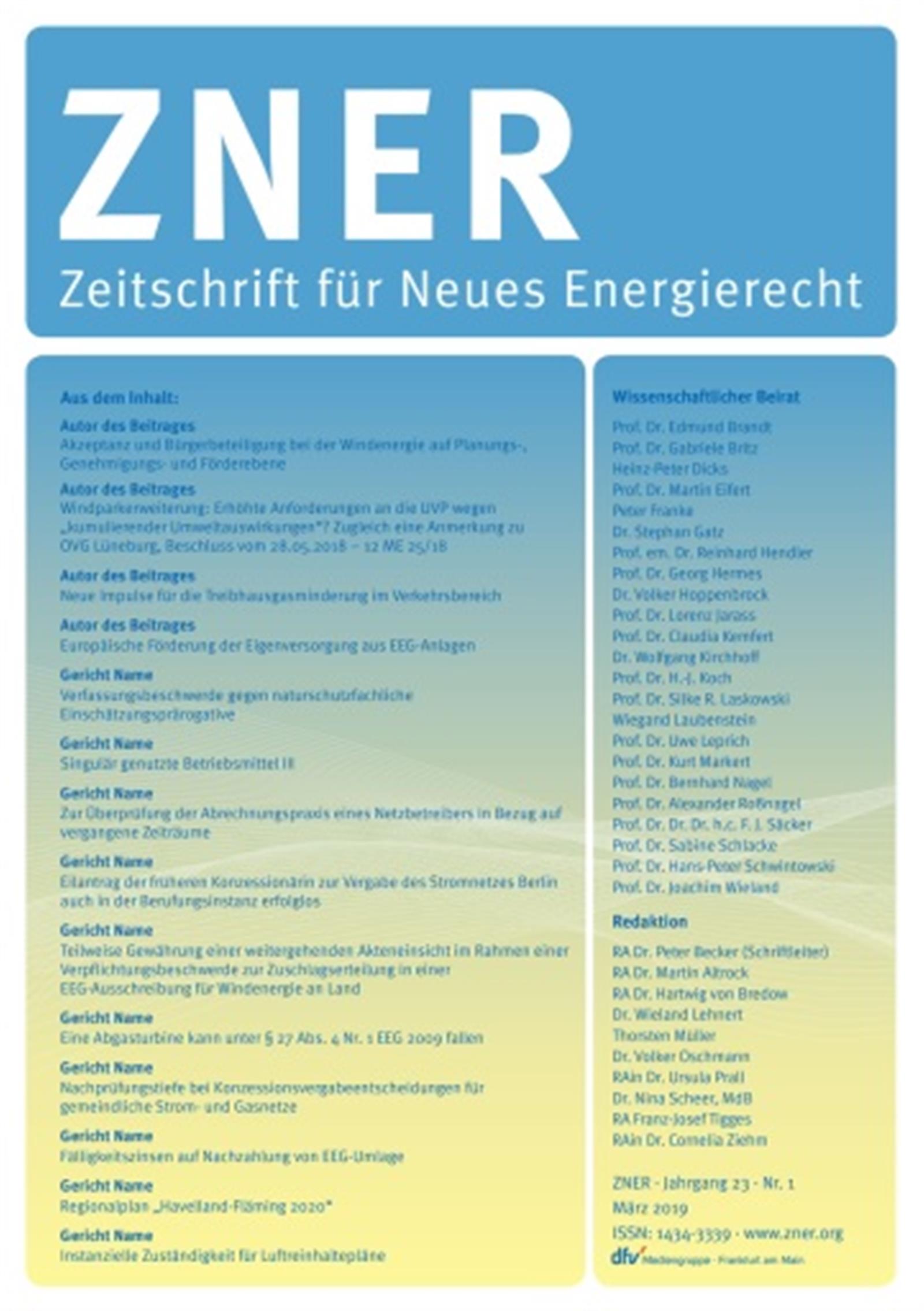 Die ZNER ist die führende rechtswissenschaftliche Zeitschrift, die sich diese Themen zur Aufgabe gemacht hat. Es werden die relevanten Rechtskonflikte um Erneuerbare Energien in Form von Aufsätzen, Dokumentationen und Besprechungen von Gerichtsurteilen behandelt.