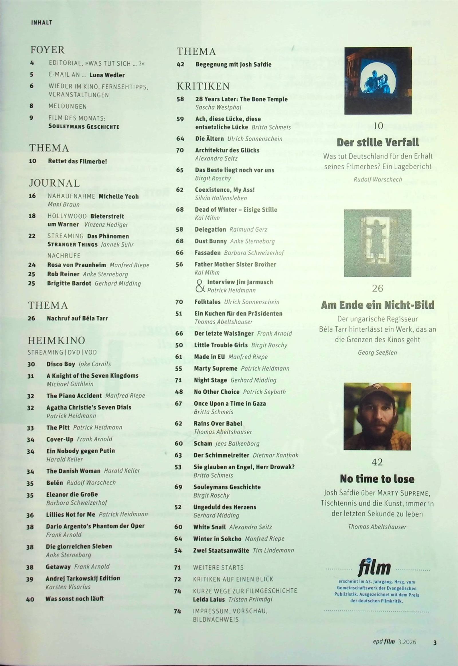 Auf über 70 Seiten präsentiert die epd Film eine Übersicht über das aktuelle Kinoprogramm. Dazu gehören neben Filmkritiken auch Interviews und Porträts mit den Filmschaffenden. Kameraleute, Regisseure, Autoren werden ebenso gewürdigt wie Schauspieler und Produzenten. Einer Persönlichkeit wird in jeder Ausgabe – dem Star des Monats – besondere Beachtung geschenkt. Gern hält das Magazin seine Leser auch über die Trends und Tendenzen in der Kinoszene auf dem Laufendem. Informiert mit Reportagen und Berichten über Filmländer aus aller Welt. Zugleich klärt die epd Film mit Hintergrundberichten über spannende Filmprojekte auf, setzt sich mit Themen wie der Zukunft des Kinos und technischen Entwicklungen auseinander. Komplettiert mit News aus Filmpolitik und Filmwirtschaft, wissenswerten Festival-Specials sowie filmhistorischen Analysen weiß die Zeitschrift zu überzeugen.