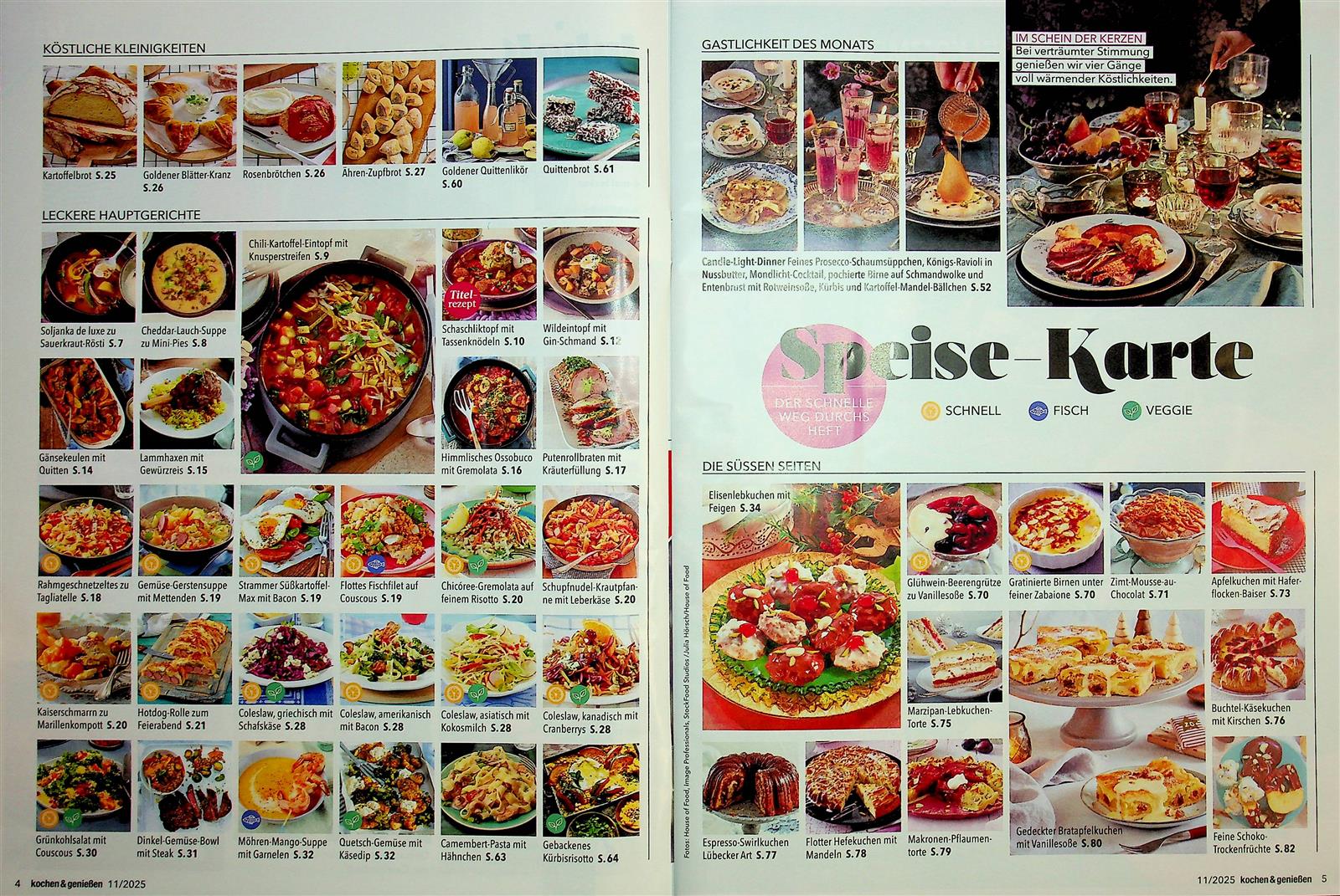 Erwähnenswert an kochen & genießen ist der hohe Praxisbezug, der sich in jeweils rund 50 Koch– und Backrezepten pro Ausgabe widerspiegelt.