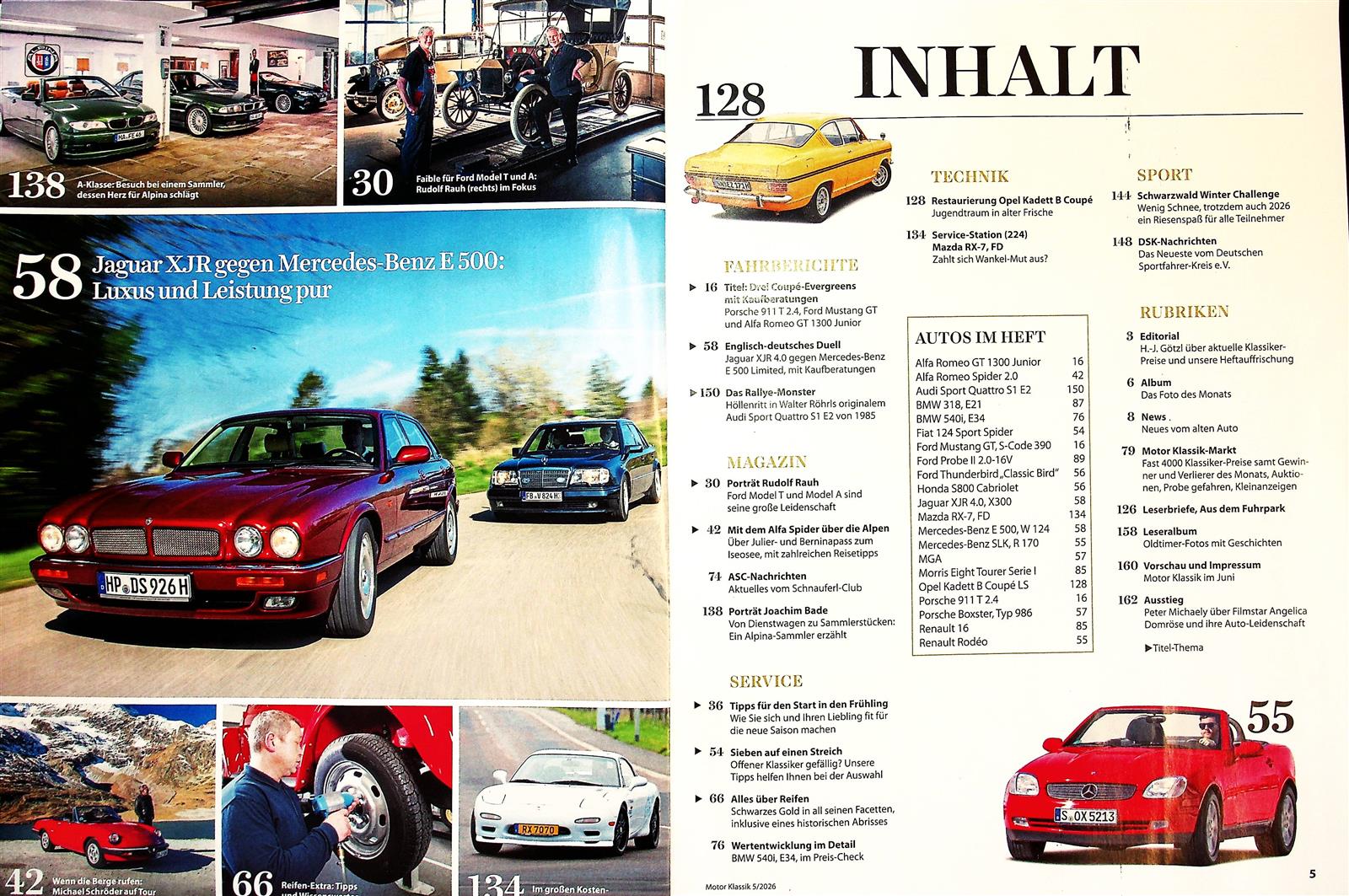 Die Titelgeschichte stellt drei Coupé-Klassiker gegenüber: Alfa Romeo GT 1300 Junior, Ford Mustang GT und Porsche 911 T 2.4. Der Text beschreibt die jeweiligen Charaktere — den italienischen Stil und Leichtbau beim Bertone, das amerikanische Hubraum-Erlebnis beim Mustang und die puristische Leichtbau-Performance beim frühen 911 — und erklärt technische Daten, Fahrgefühl und Alltagstauglichkeit. Zudem werden typische Schwachstellen, Ersatzteilversorgung und Kaufberatungspunkte für jeden Typ aufgezeigt. Für Leser liefert der Artikel konkrete Hinweise, welche Modelle für welchen Einsatzzweck passen und worauf beim Kauf zu achten ist.